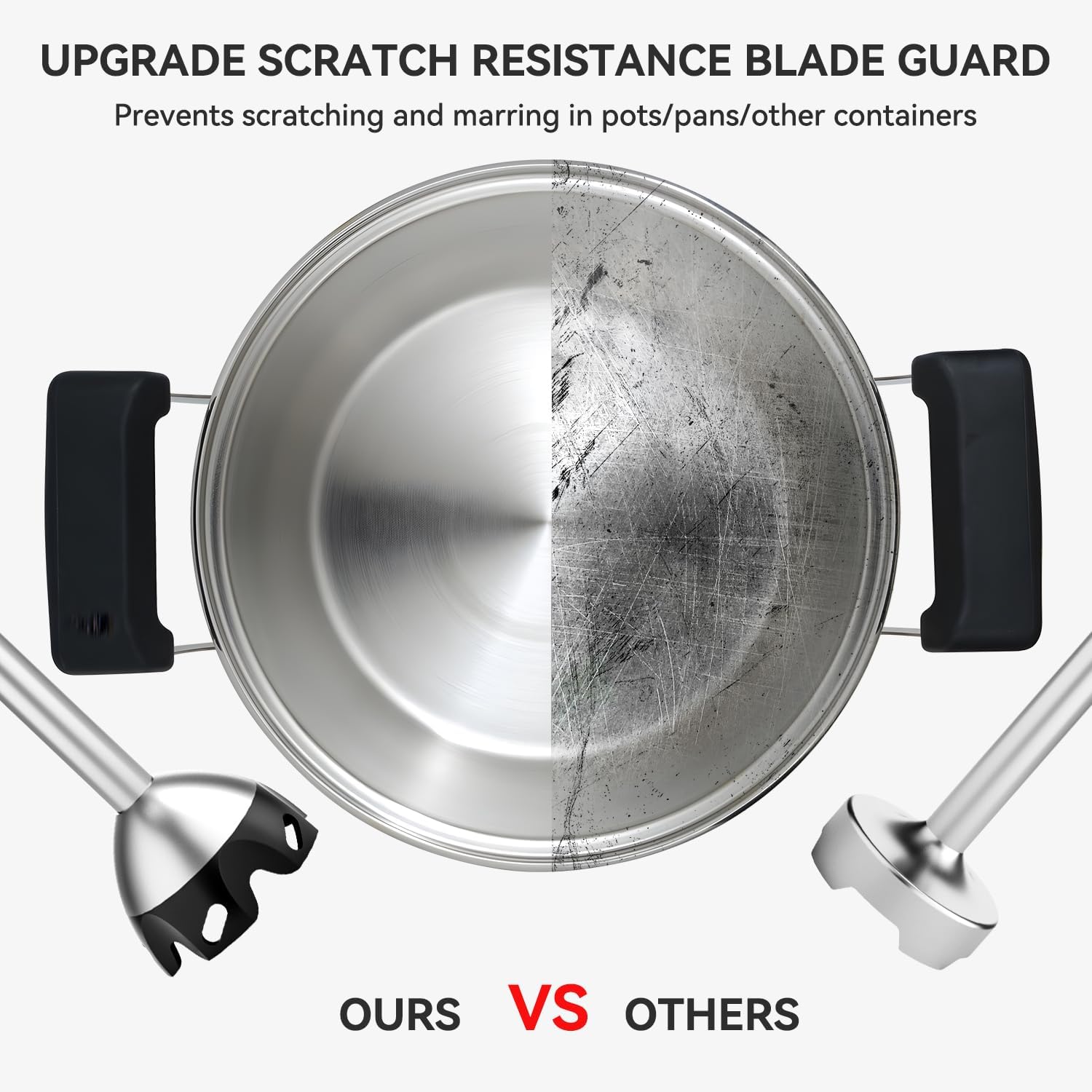 - THOUGHTFUL SCRATCH RESISTANT FEATURE & SAFE: The upgraded hand blender scratch-resistant blade guard design specifically protects non-stick cookware, allowing you to choose any of your pots or pans, and no more worry about scratching them. The blender combo is made of BPA-free plastic and 304 stainless steel, which is safe, healthy, and long-lasting.
